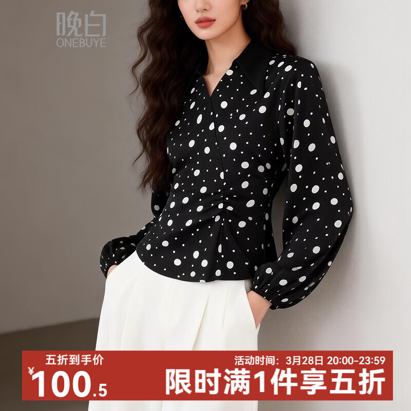 晚白2026年春款经典复古波点翻领上衣轻薄垂顺利落通勤设计感衬衫女 黑色 XL