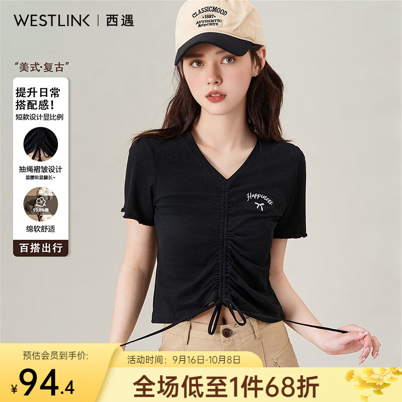 西遇XD正肩短袖T恤2025夏季新款不规则V领抽绳修身短款上衣 黑色 S