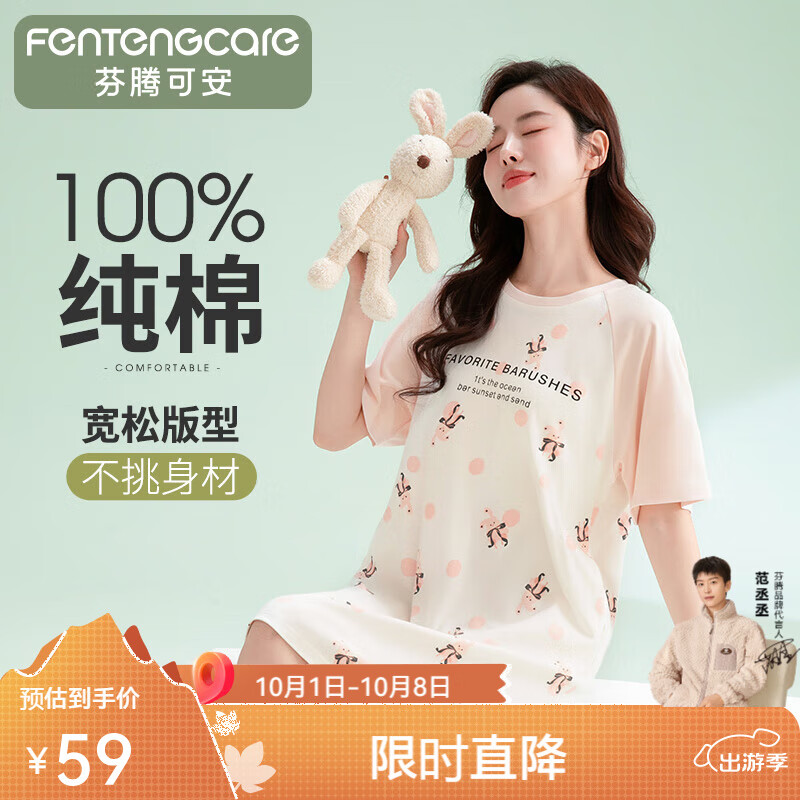 芬腾可安睡裙女【100%纯棉】2025新款圆领短袖休闲短裙女士家居服卡通少女 粉色 XL