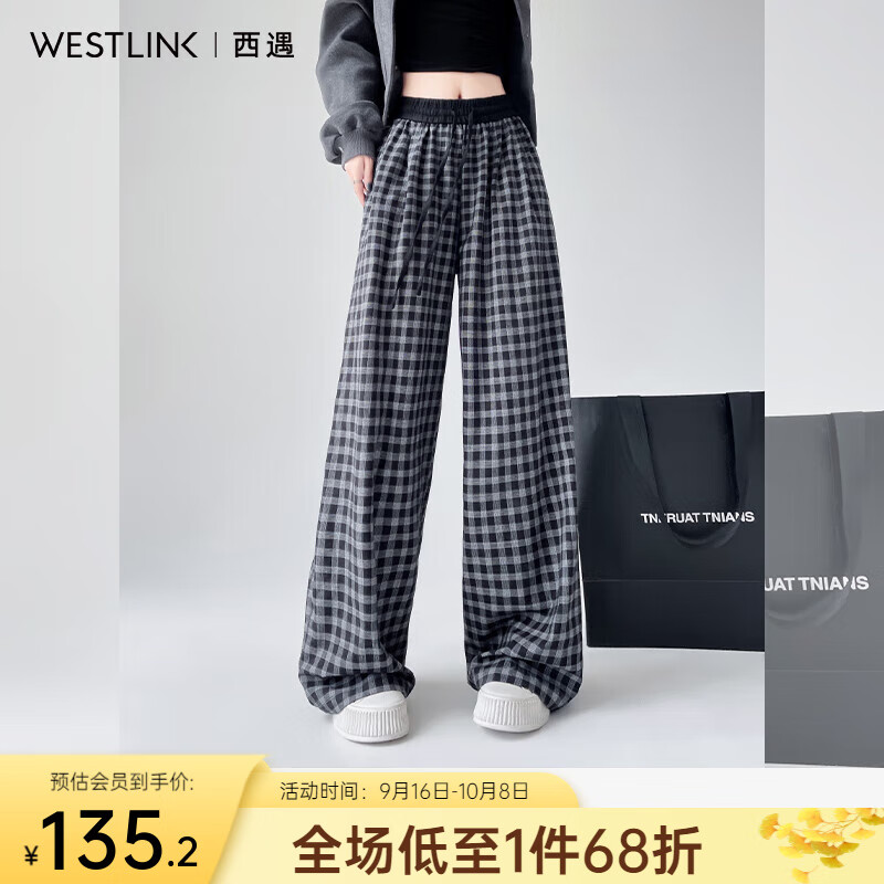 西遇(Westlink)格子休闲裤女2025年秋季新款复古高腰抽绳垂感宽松阔腿长裤 黑色 (预售15天) S (26)