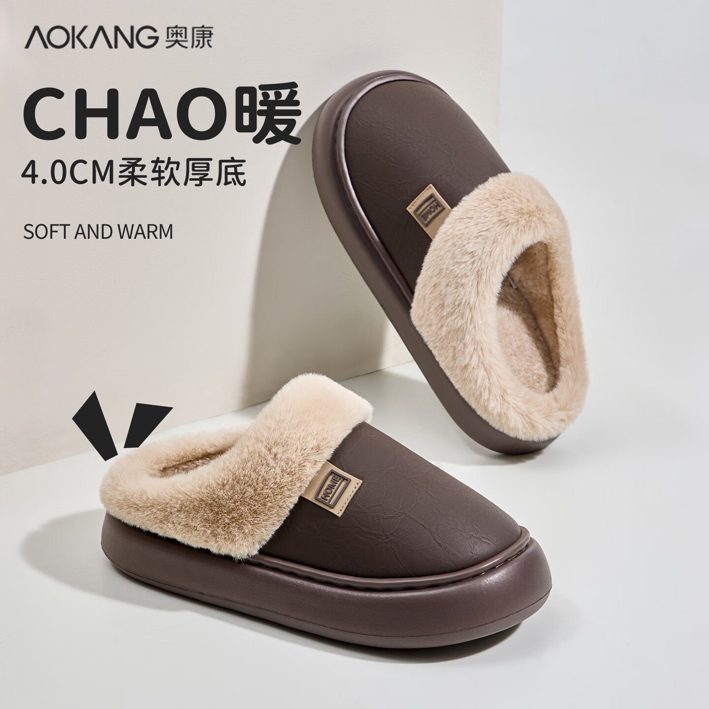 奥康(Aokang)抗菌棉拖鞋秋冬季2025新款男士室内居家用毛绒厚底防滑保暖拖鞋男 深咖色 42-43 【适合41-42】