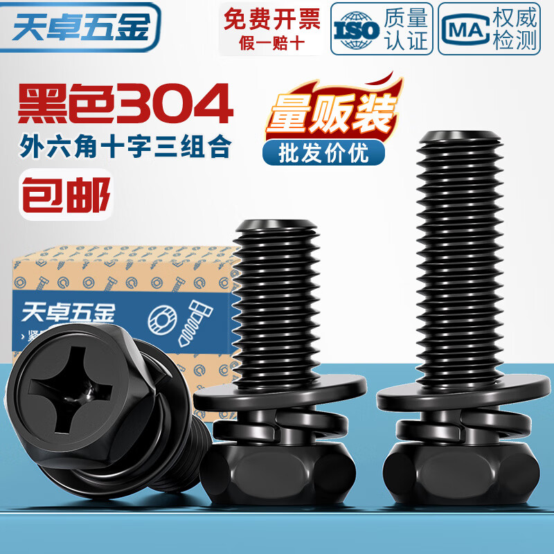 天卓五金黑色304不锈钢外六角三组合螺丝凹穴十字六角平弹组合MM3M4M5M6M8 ---以下为【304黑色】---