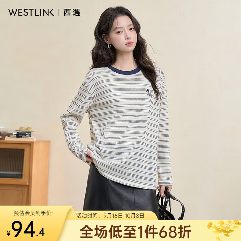 西遇(Westlink)西遇撞色条纹长袖T恤女秋季新款慵懒松弛圆领宽松内搭上衣 杏+蓝色 (预售15天) M (160)