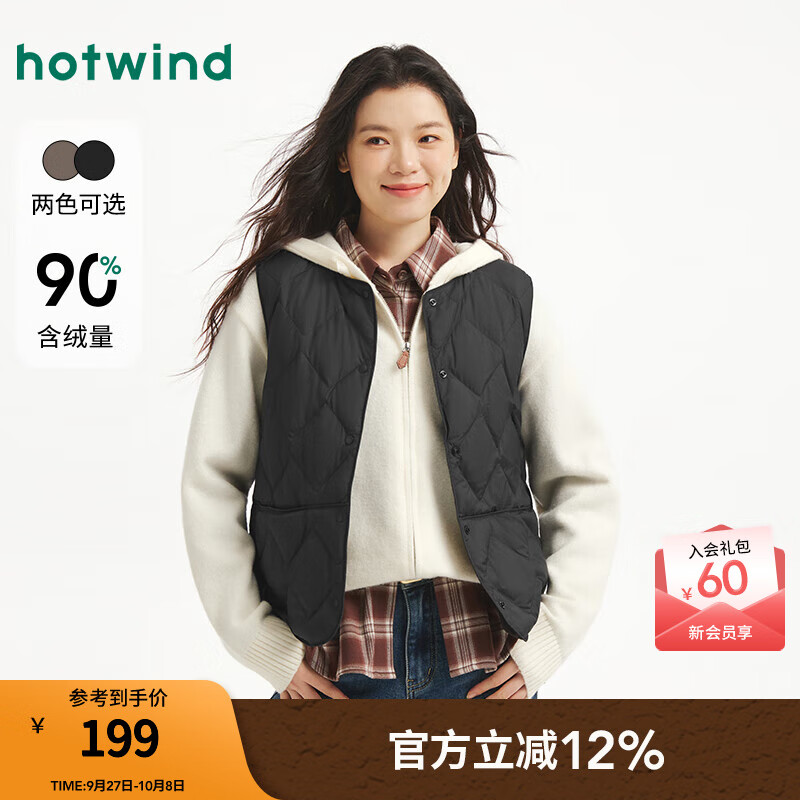 热风(Hotwind)女士轻薄羽绒服马甲2025年冬季新款羽绒内搭保暖叠穿马甲背心 01黑色 L