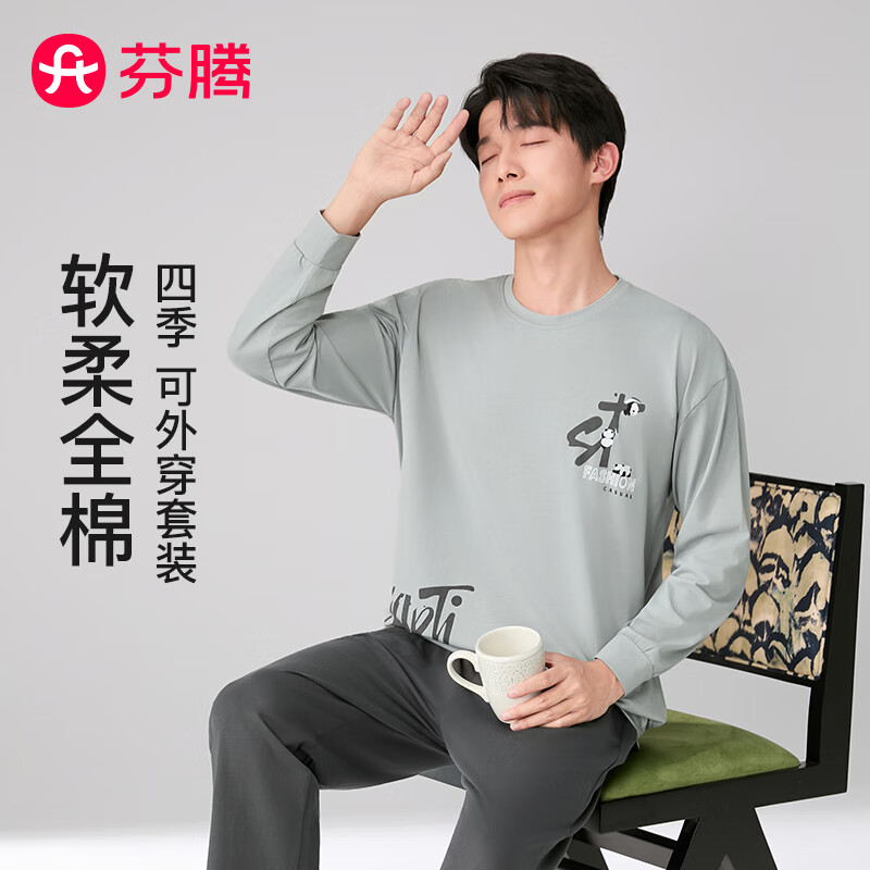 芬腾睡衣男100%棉2025秋季新款休闲运动风卫衣宽松舒适居家服套装外穿 浅灰 L