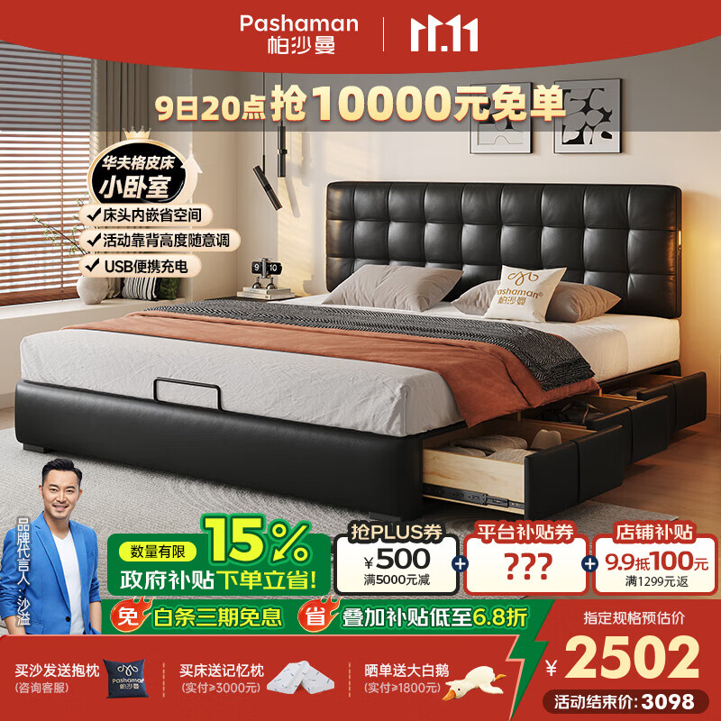 帕沙曼华夫格真皮床超薄床头黑色主卧床双人复古储物床小户型次卧8329CP 【榉木整架排骨架】单床 气动储物结构1800mm*2000mm