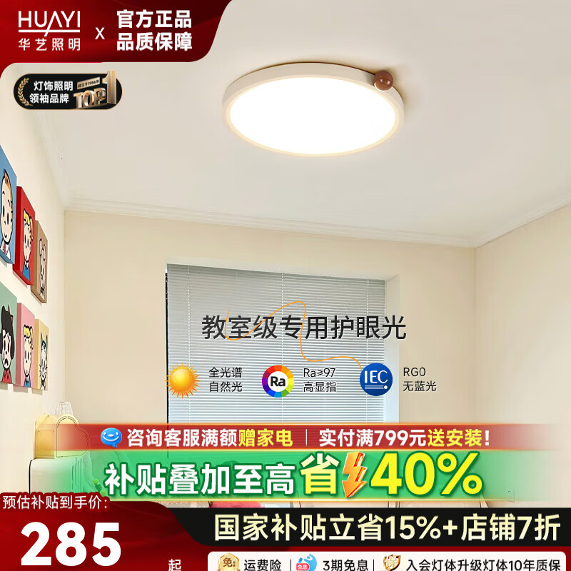 华艺照明现代简约奶油风吸顶灯超薄无缝隙LED灯全光谱高显家用主次卧灯具 【升级铝】全光谱50CM-三色