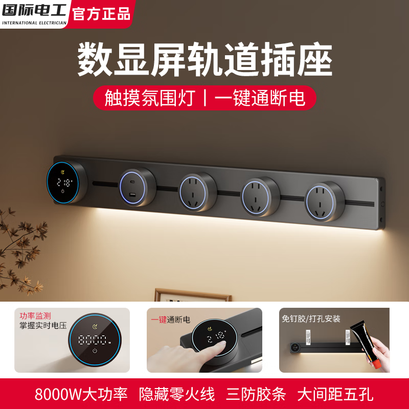 国际电工智能数显屏定时电力轨道插座带灯可移动挂壁式扩展导轨五孔电源插 柔雾灰 USB+Type-c适配器(不含轨道)