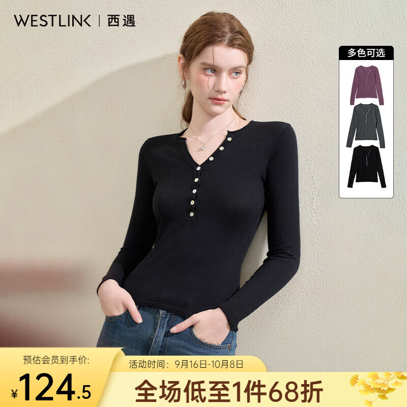 西遇(Westlink)西遇纽扣V领长袖针织衫女2025秋季新款气质修身显瘦打底衫上衣 黑色 M (160)