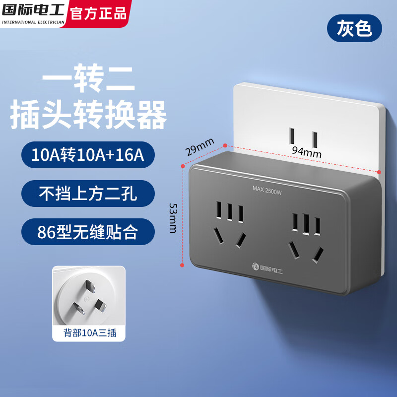 国际电工大功率一字型转换插座10A转16A空调热水器一转多无线扩展电源插 一转二【10A转10A五孔+16A五孔】灰