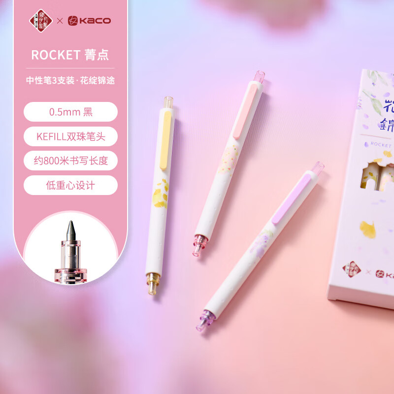 KACO菁点中性笔3支装花绽锦途国子监联名0.5黑芯按动式签字笔高颜值学生书写大容量顺滑子弹头速干 花绽锦途