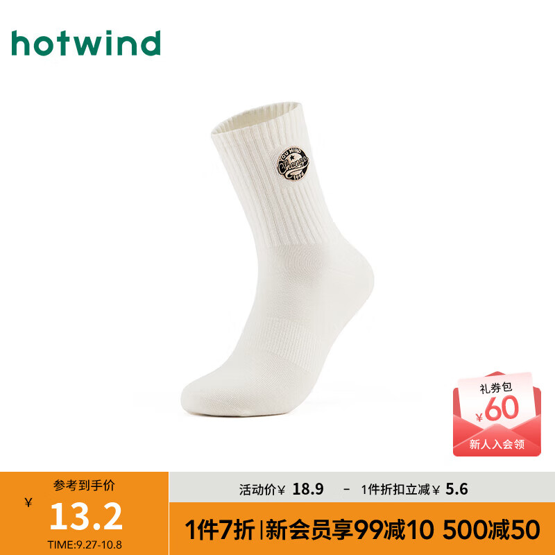 热风男士中帮袜2025年秋季新款简约刺绣弹力百搭户外运动中帮袜 04白色 1双 均码