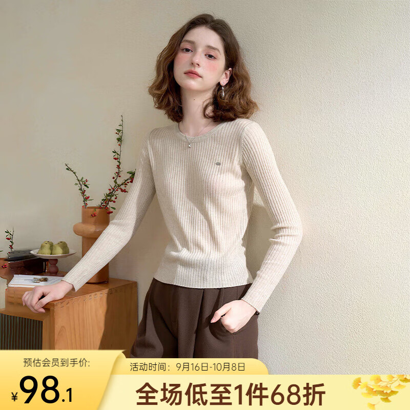 西遇优雅气质坑条圆领长袖针织衫女2025秋季显瘦内搭打底衫上衣 杏色 M (160)