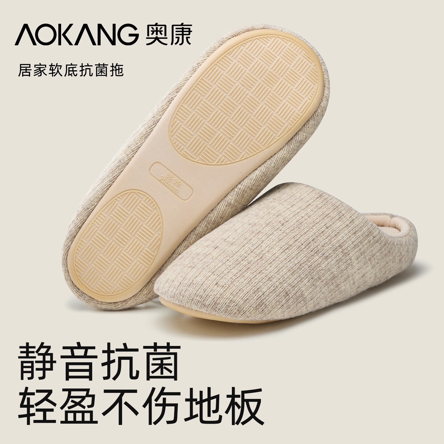 奥康(Aokang)静音棉拖鞋女秋冬季室内居家防滑日式软底无声地板抗菌防臭拖鞋男 浅卡其 42-43 【适合41-42】