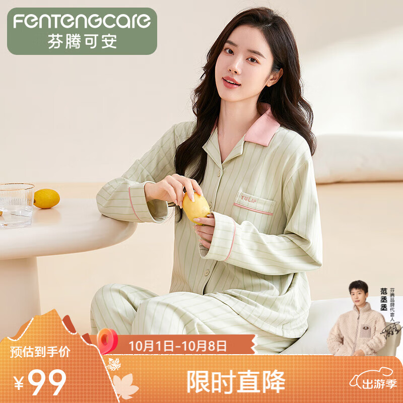 芬腾可安睡衣女100%纯棉条纹秋季开衫翻领家居服女士睡衣套装可外穿 绿色 XL