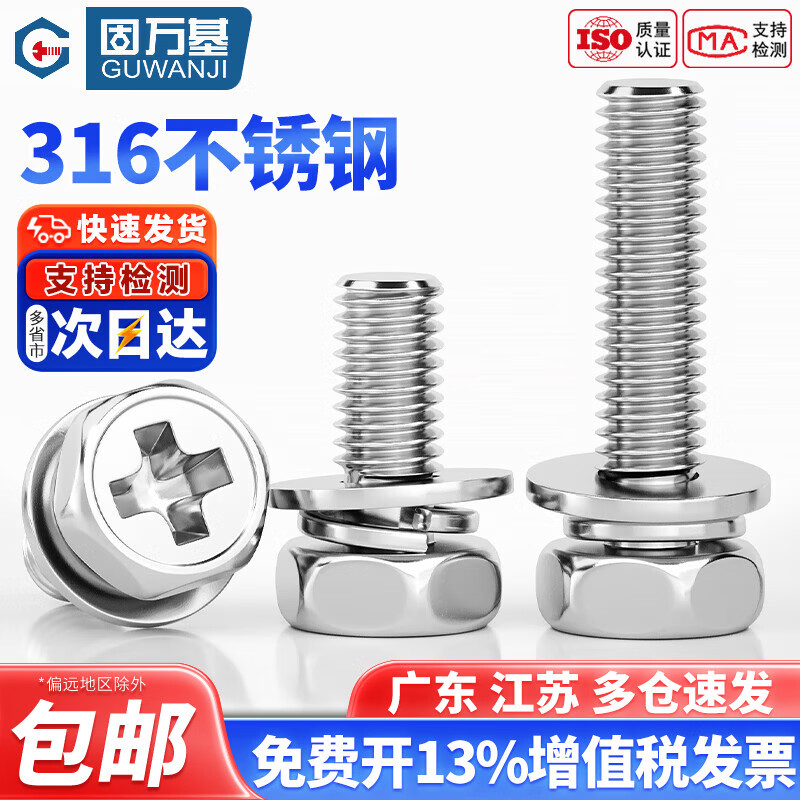 固万基(GUWANJI)316不锈钢十字外六角三组合螺丝钉 凹穴自带平垫弹垫螺栓M3M4M5M8 M6x10x12(10只)
