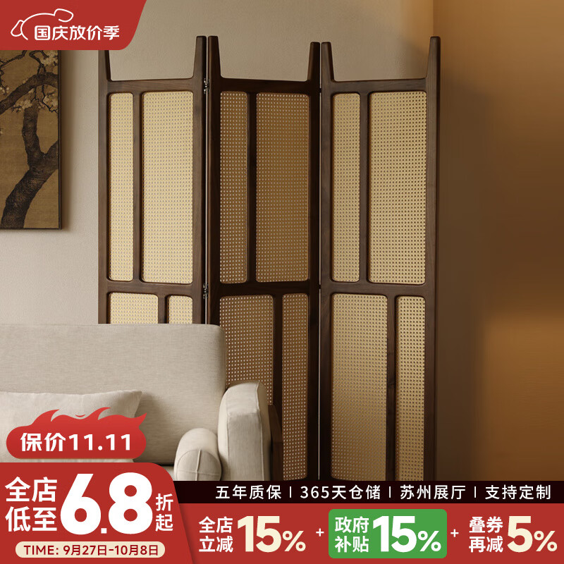 晨物北美黑胡桃全实木藤编屏风隔断遮挡可移动客厅隔断墙隔板挡板 浔古 屏风 150*195cm