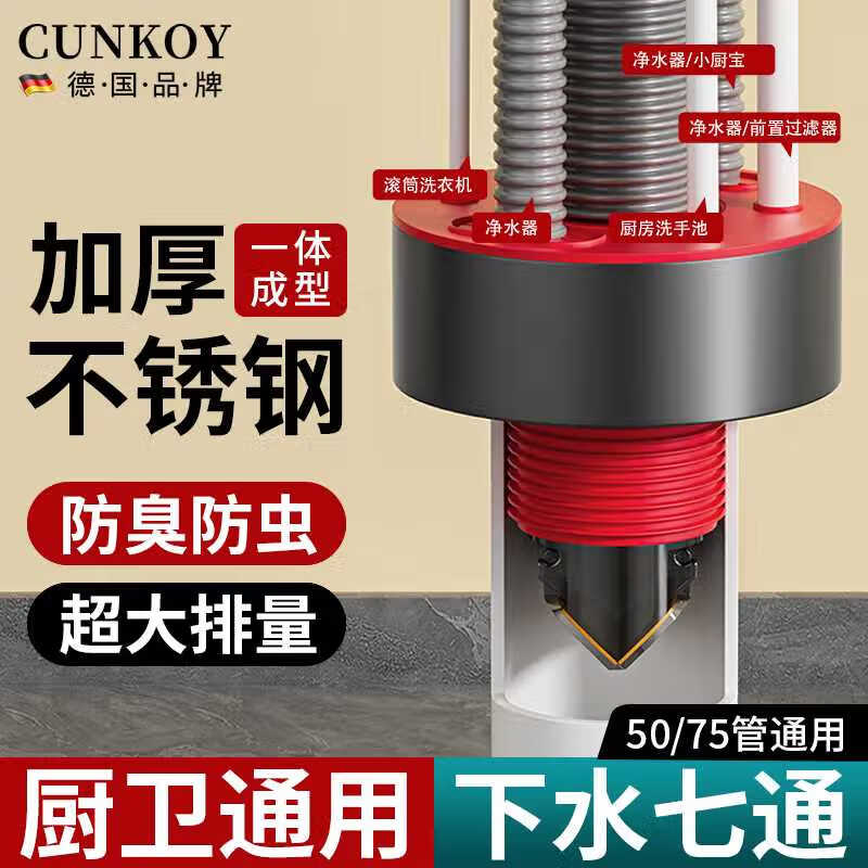 CUNKOY【德国】厨房下水三通下水道防臭神器七通接头不锈钢防臭塞封口器 升级双开-不锈钢七通防臭塞【枪灰】 升级双开大排量丨防臭防虫防反味