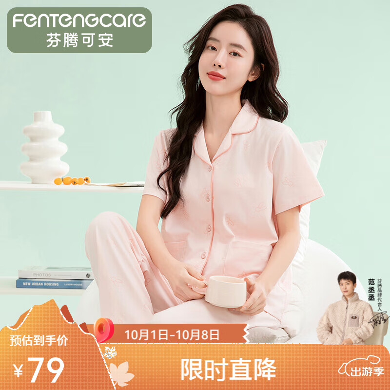 芬腾可安睡衣女【100%纯棉】2025新款翻领短袖长裤卡通休闲家居服套装女士 浅虾 M
