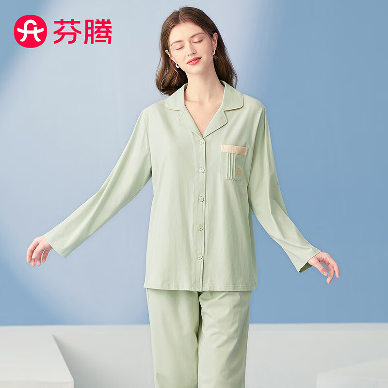 芬腾睡衣女纯棉5A抑菌翻领情侣开衫宽松外穿长袖家居服女睡衣套装 浅绿 2XL