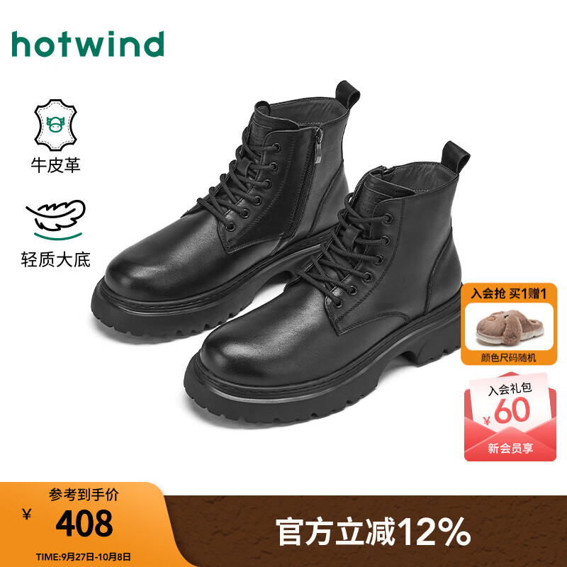 热风(Hotwind)【商场同款】男鞋2025年冬季新款英伦风厚底马丁靴百搭户外休闲靴 01黑色 (牛头层皮革) 41