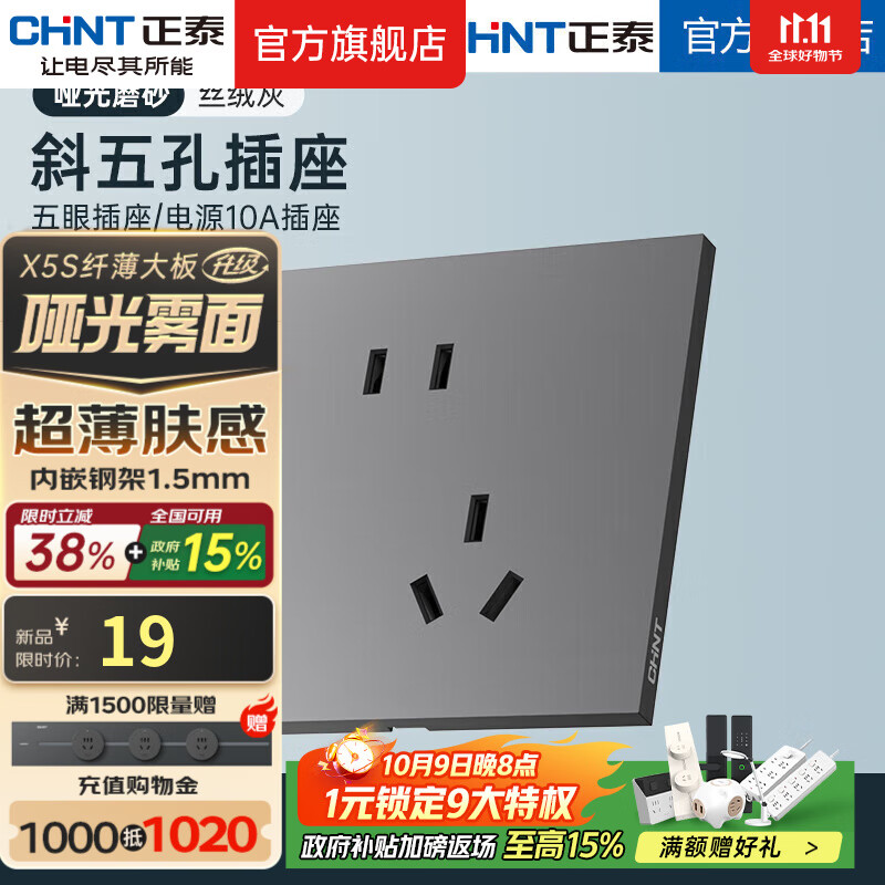 正泰(CHNT)薄哑光开关插座磨砂面板奶油风86型家用五孔插座面板X5S丝绒灰 斜五孔插座