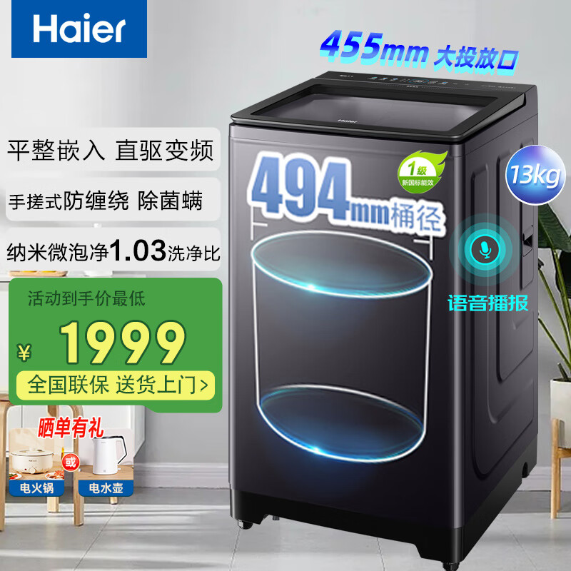 海尔(Haier)波轮洗衣机全自动13公斤大桶径手搓式防缠绕纳米微泡语音播报直驱变频1级能效除菌螨BS57B 13kg|七维减震|494大桶径|一键洗脱