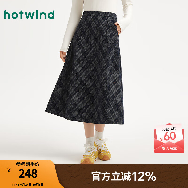 热风女士格纹半身裙2025年冬季新款松紧腰高腰文艺复古显瘦半裙 35兰格子 M