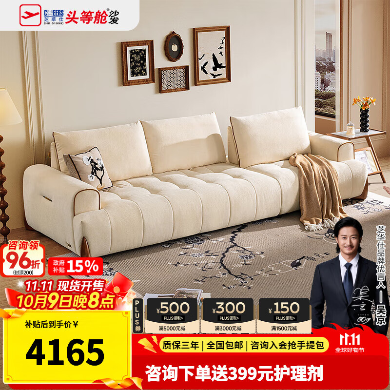 芝华仕实木沙发可移动靠背泡芙沙发轻客厅奢高级感2025新款白月光2081D 糯米白-3.1M-可移动靠背+雪尼尔 延期发货(详询客服)