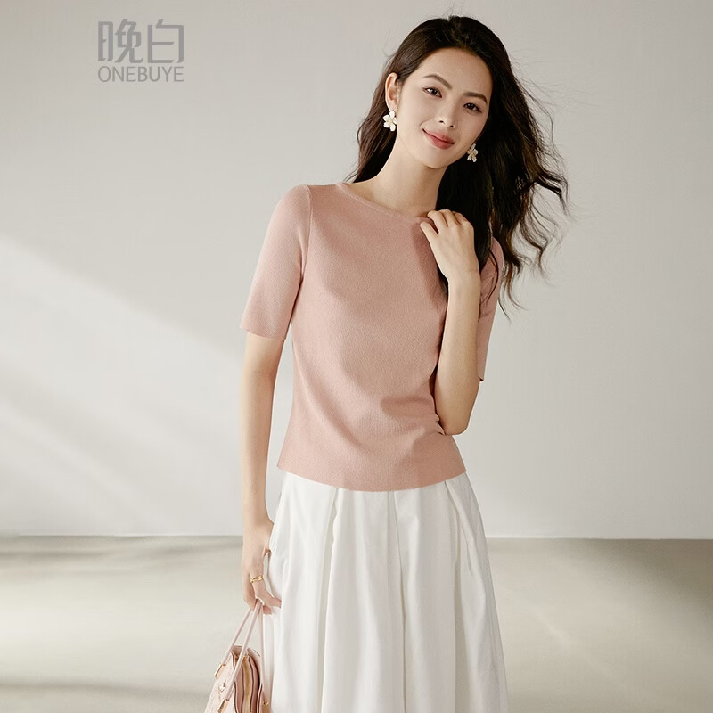 晚白【新品】2026年春款时尚纯色圆领上衣弹力修身减龄针织衫女 藕粉色 L