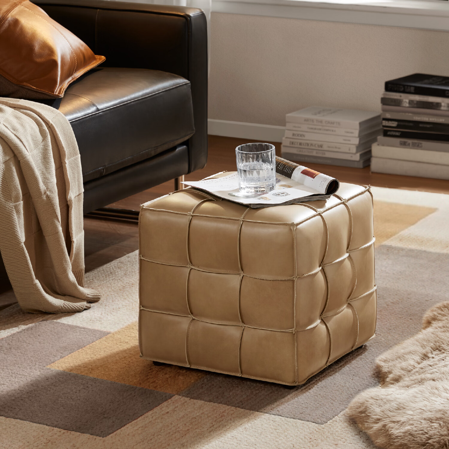 Harbor House美式进口头层牛皮沙发凳玄关换鞋凳魔方小皮凳 Philo Philo小皮凳-头层牛皮-浅驼色 长410X宽410X高382mm