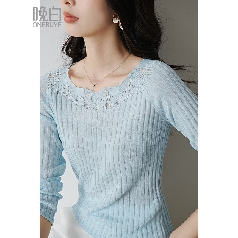 晚白2026年春款气质baby蓝圆领蕾丝镂空一字肩上衣法式温柔薄款针织衫 天蓝色 M