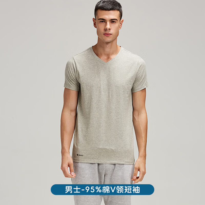 洁丽雅短袖含棉夏季T恤宽松透气潮流纯色短袖男运动休闲男士短袖 浅灰色【V领1件】 L