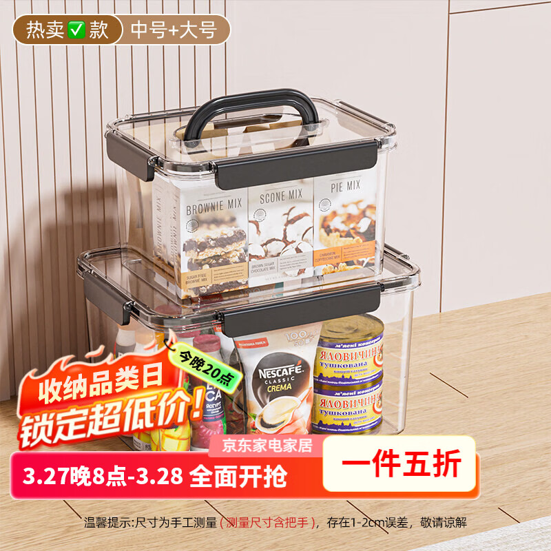 纳份爱透明手提收纳箱玩具零食书本收纳盒子家用带盖密封大容量整理箱 高透PET【中号+大号】超值组合装