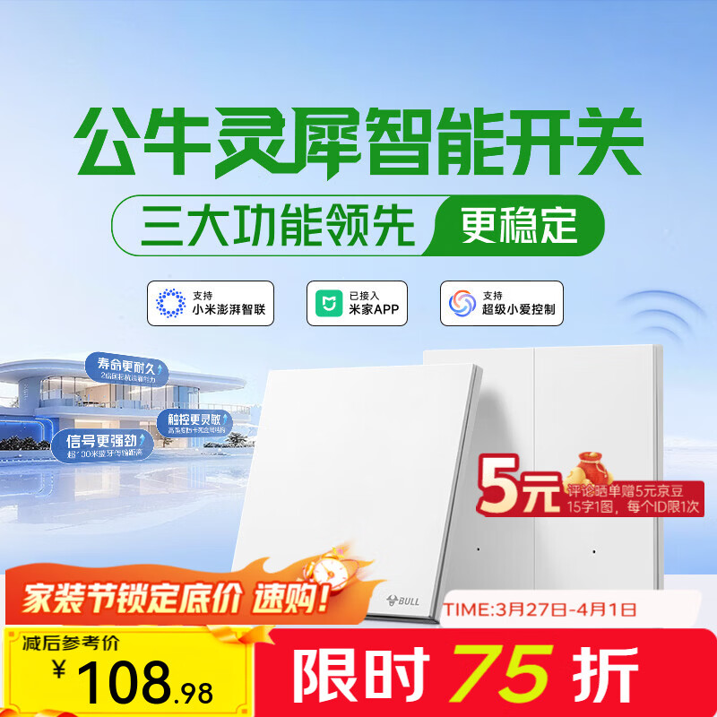 公牛(BULL)灵犀超薄智能开关面板 接入米家系统 支持小爱语音控制 米绒白 【智能四开(零火版)】情景开关