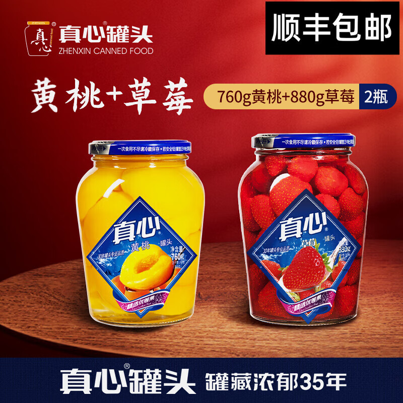 真心罐头 黄桃草莓水果草莓罐头880g罐头瓶装休闲零食即食中秋节送礼 黄桃880g+草莓880g