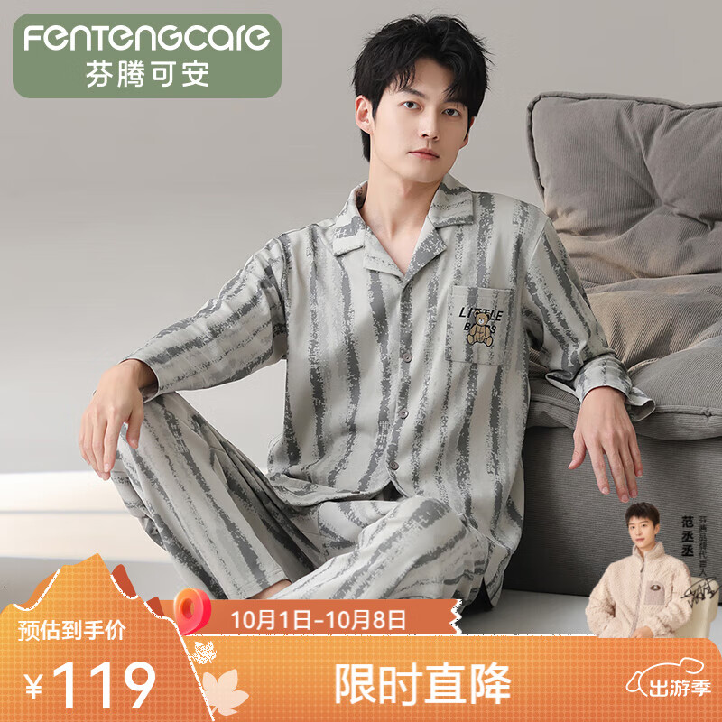 芬腾可安睡衣男2025秋新款纯棉老钱风条纹春款翻领长袖长裤宽松家居服套装 灰蓝 3XL
