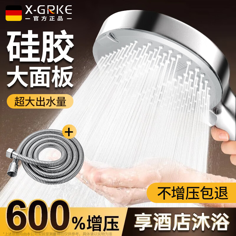 X-GRKE【德国】增压淋浴花洒喷头全套装强劲家用多功能洗澡手持莲蓬头 电镀银丨六档花洒+1.5m软管 六档出水切换丨自洁硅胶大面板