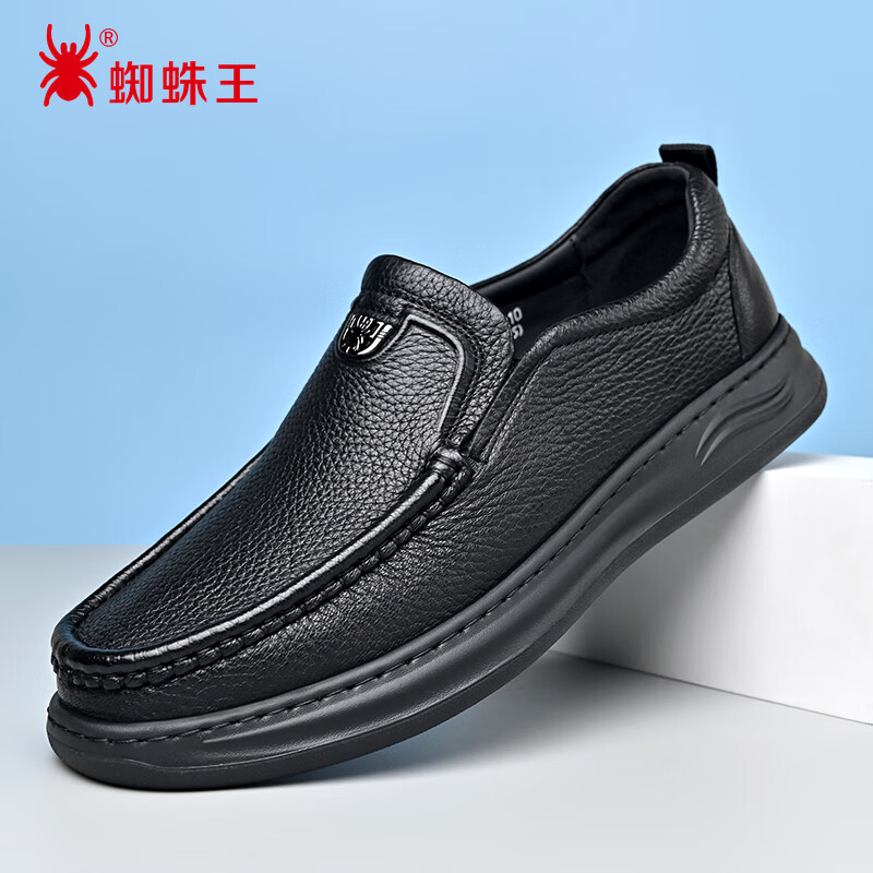 蜘蛛王男鞋春秋休闲皮鞋男士软底一脚蹬鹿皮鞋子男中年爸爸鞋 黑色 39