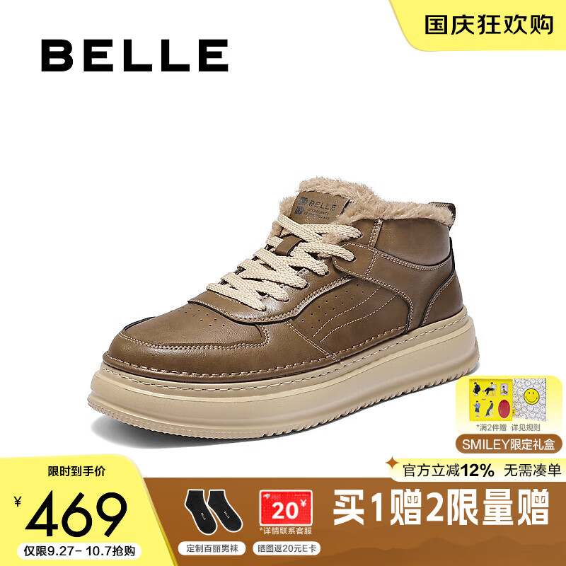 百丽复古潮搭高帮休闲鞋男2025冬季新款厚底板鞋加绒8QZ11DD5 卡其色-绒里 44 (270mm)
