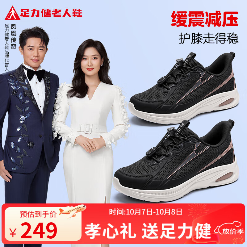 足力健老人鞋秋季新品缓震散步鞋爸爸鞋免系鞋带运动鞋送礼长辈 黑色-女款 37