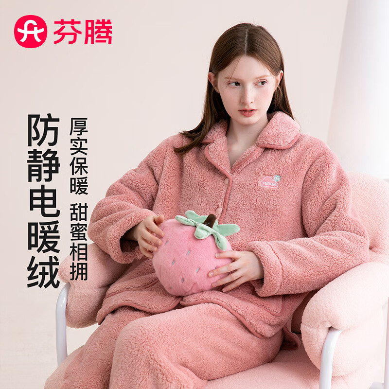 芬腾情侣睡衣双面暖绒防静电2025秋冬新款保暖开衫宽松情侣家居服套装 暖粉-女款 XL