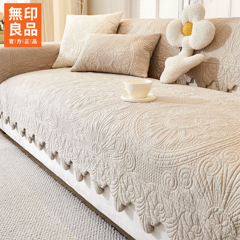 无印良品沙发垫纯棉加厚沙发座垫固定防滑全棉坐垫沙发套罩四季通用 花开-富贵咖色【100%纯棉 环保亲肤不致敏】 90*260【适合长度240-260cm的沙发】