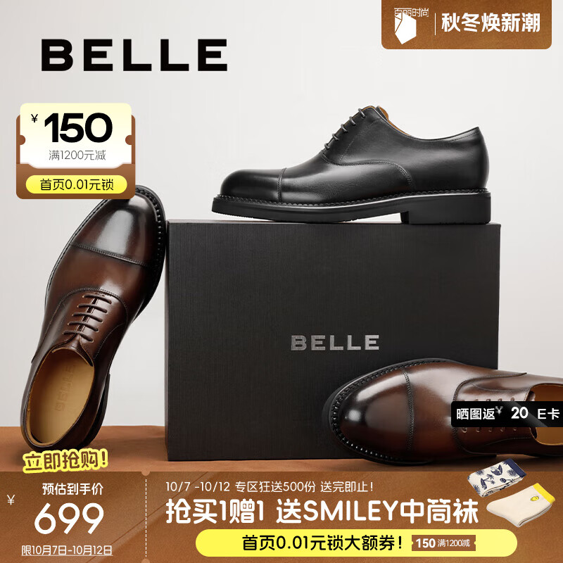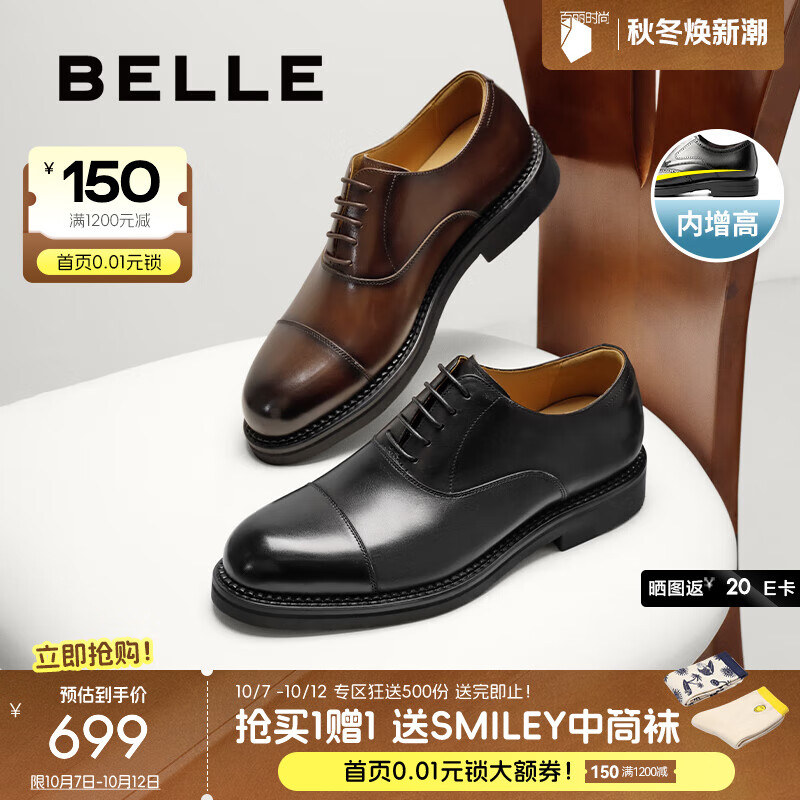 百丽(Belle)【礼盒款】三接头牛津鞋男2025新款商务正装皮鞋A2126CM5 黑色-内增高 43 (265mm)