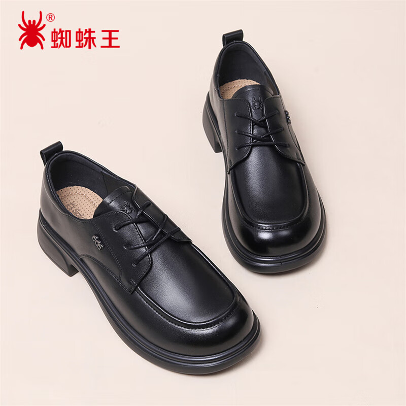 蜘蛛王乐福鞋女牛皮秋季系带工作鞋软底轻便小皮鞋单鞋子 黑色 38