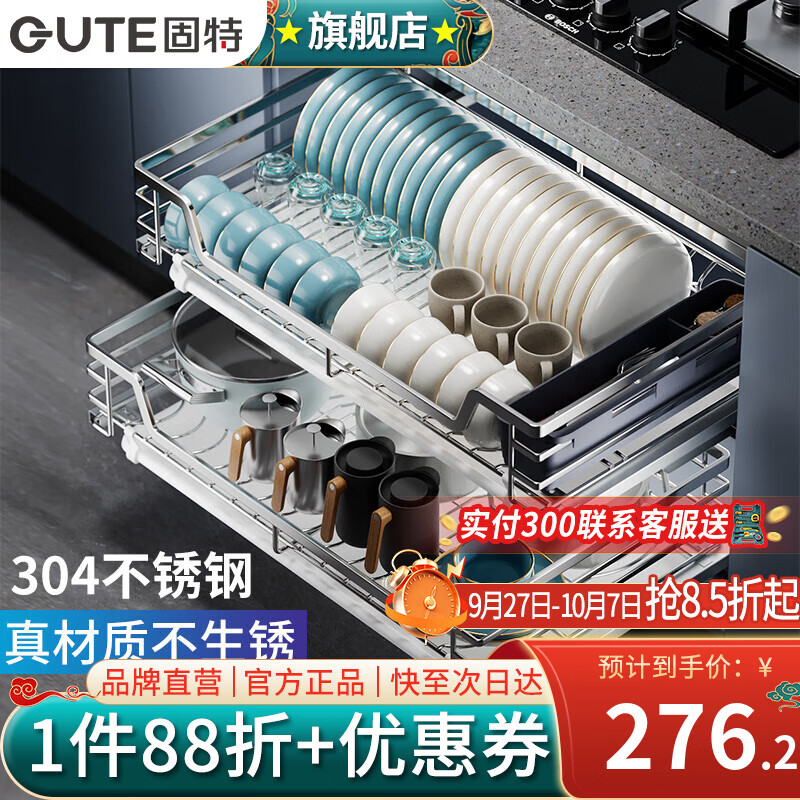 固特(GUTE)厨房拉篮304不锈钢橱柜抽屉式厨房碗柜碗架碗筷置物架调味拉篮 304不锈钢【600柜】扁钢 深度≥430
