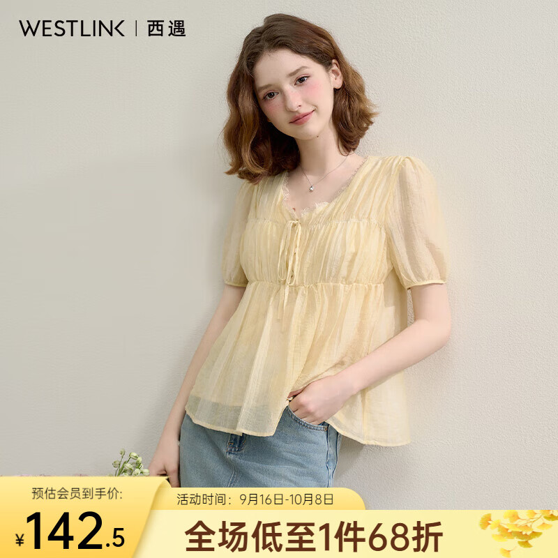 西遇天丝温柔缩褶波纹肌理感衬衫女2025春季娃娃款V领衬衣 浅黄色 S (155)