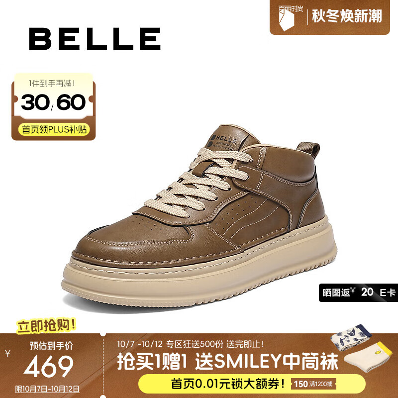 百丽(Belle)复古潮搭高帮休闲鞋男2025冬季新款厚底增高板鞋加绒8QZ11DD5预售 卡其色-单里 43 (265mm)