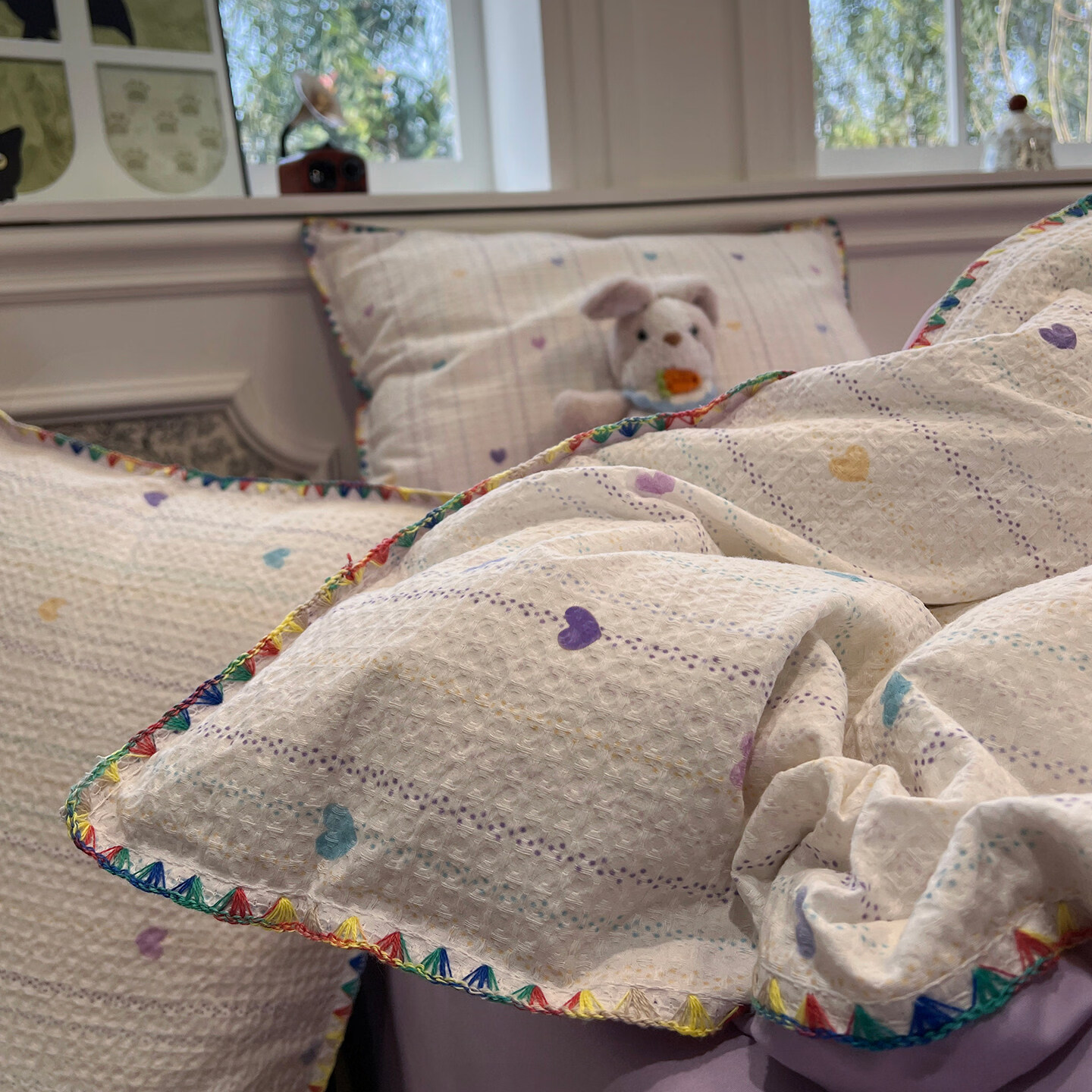 苏萱ins紫条爱心全棉华夫格床上四件套纯棉1.5m贝壳边被套床单三件套4 伊柠 1.8m 床单款 四件套-被套200x230cm