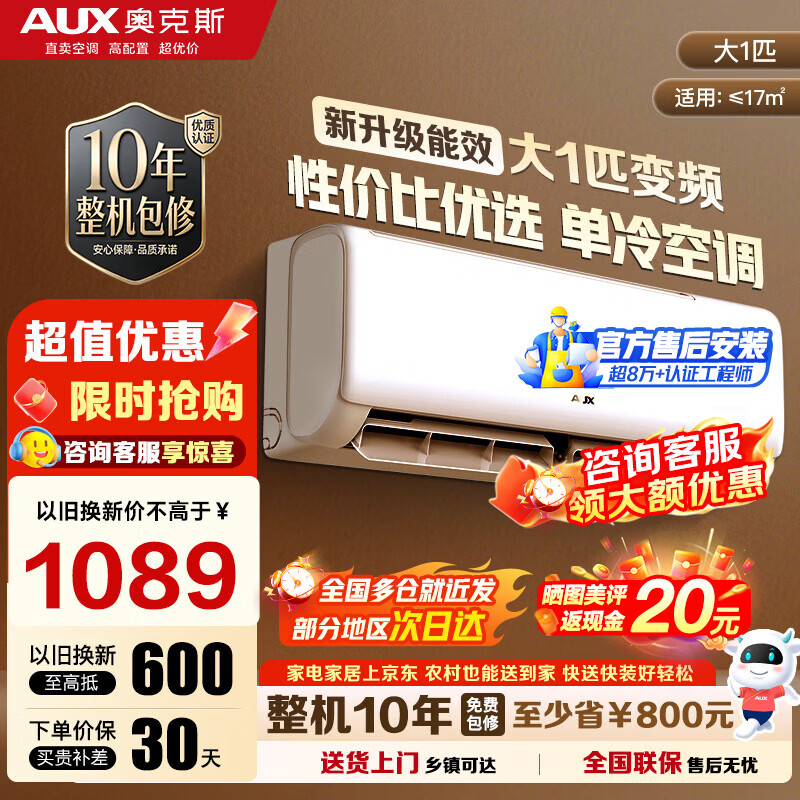 奥克斯(AUX)空调挂机大1匹/1.5匹 新一级/三级能效 变频冷暖 自清洁 家用卧室出租房壁挂式节能空调 以旧换新 大1匹 新三级能效【工厂直发】10-17㎡